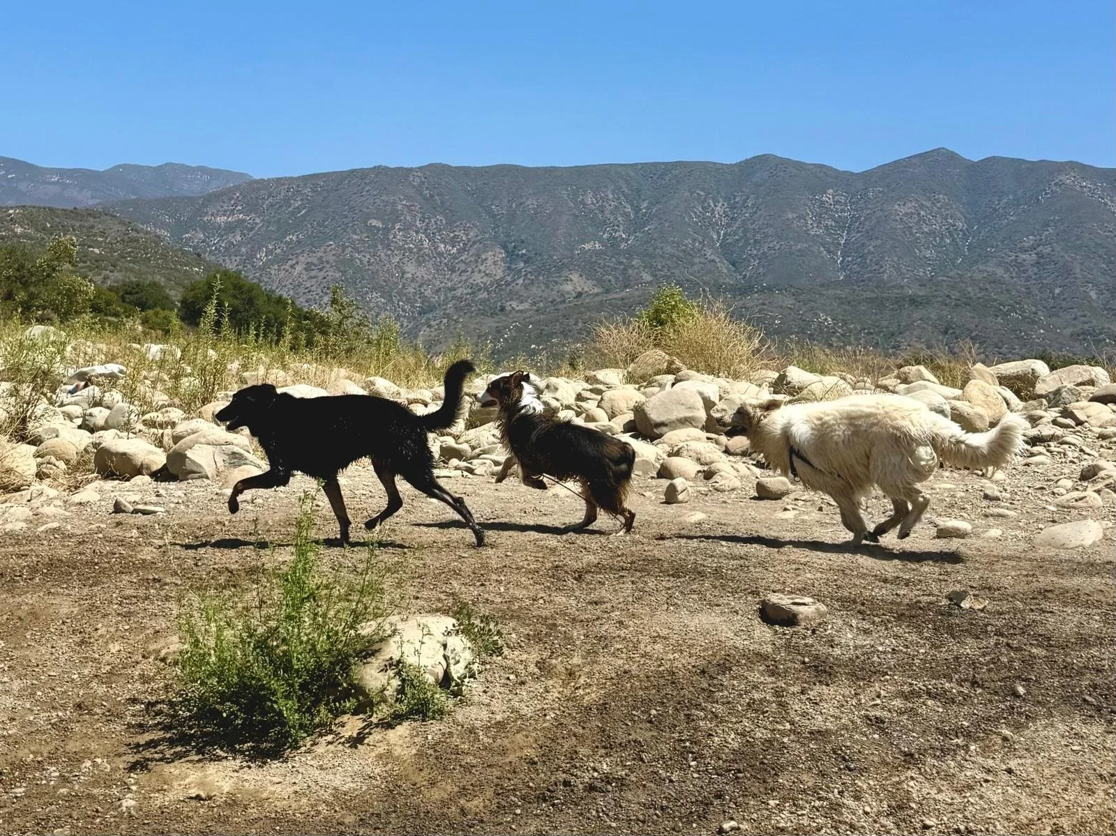 After pick up, I will take the pack to our fully fenced-in open pasture on our Petaluma home base, where the dogs get to relieve themselves and let out some morning energy. Dogs are guided through understanding structured play, staying present within themselves, and paying attention to the signals their handler or their pack members might be giving them. This moment in the day exercises the dogs’ awareness of handler, pack members, and environment.
